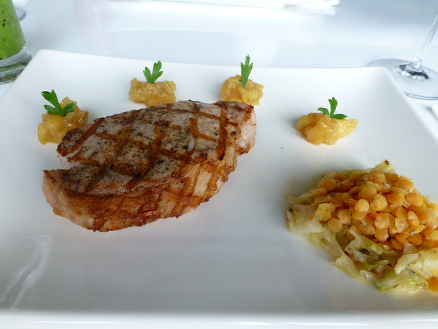 我們就在服務生推薦下吃了八分熟的豬排 旁邊還有附上梨子醬和配菜