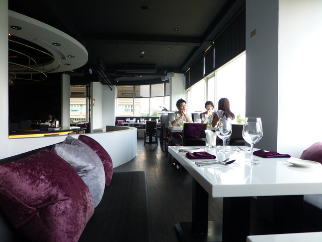 店內的裝潢很像夜店唷~ 紫色系桌巾和抱枕 放在黑白色系的桌椅上 非常的有質感