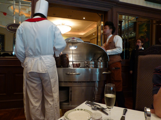 上菜的時候 主廚會推著這台餐車到餐桌旁邊 現場親自幫你把牛排切下來 很酷耶
