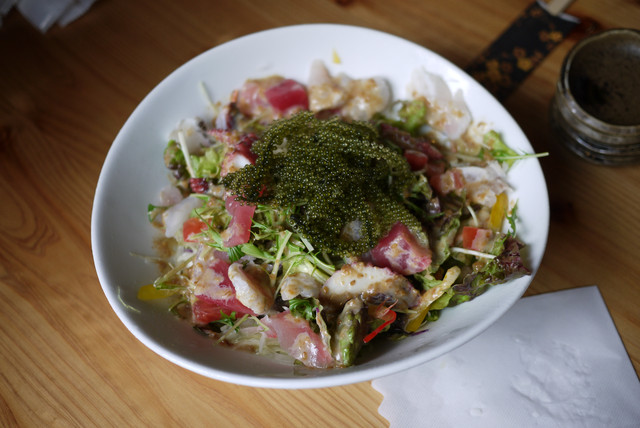 然後淋上和風胡麻醬 最後再放上沖繩當地的特產海葡萄