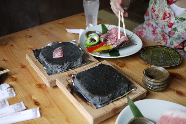 這個溶岩燒是將生肉放在熱騰騰的石板上煎熟之後拿來吃的一種料理方式 還蠻類似原住民的石板烤肉的