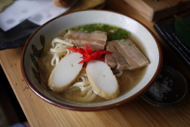 配料只簡單的放上兩片魚板和豬肉 最後灑上蔥花和醃漬過的嫩薑